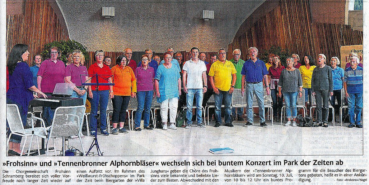 SCHRAMBERG Die Chorgemeinschaft Frohsinn-Schramberg bereitet sich voller Vorfreude nach langer Zeit wieder auf einen Auftritt vor. Im Rahmen des »Weißwurst-Frühschoppens« im Park der Zeit beim Biergarten der »Villa Junghans« geben die Chöre des Frohsinns viele bekannte und beliebte Lieder zum Besten.