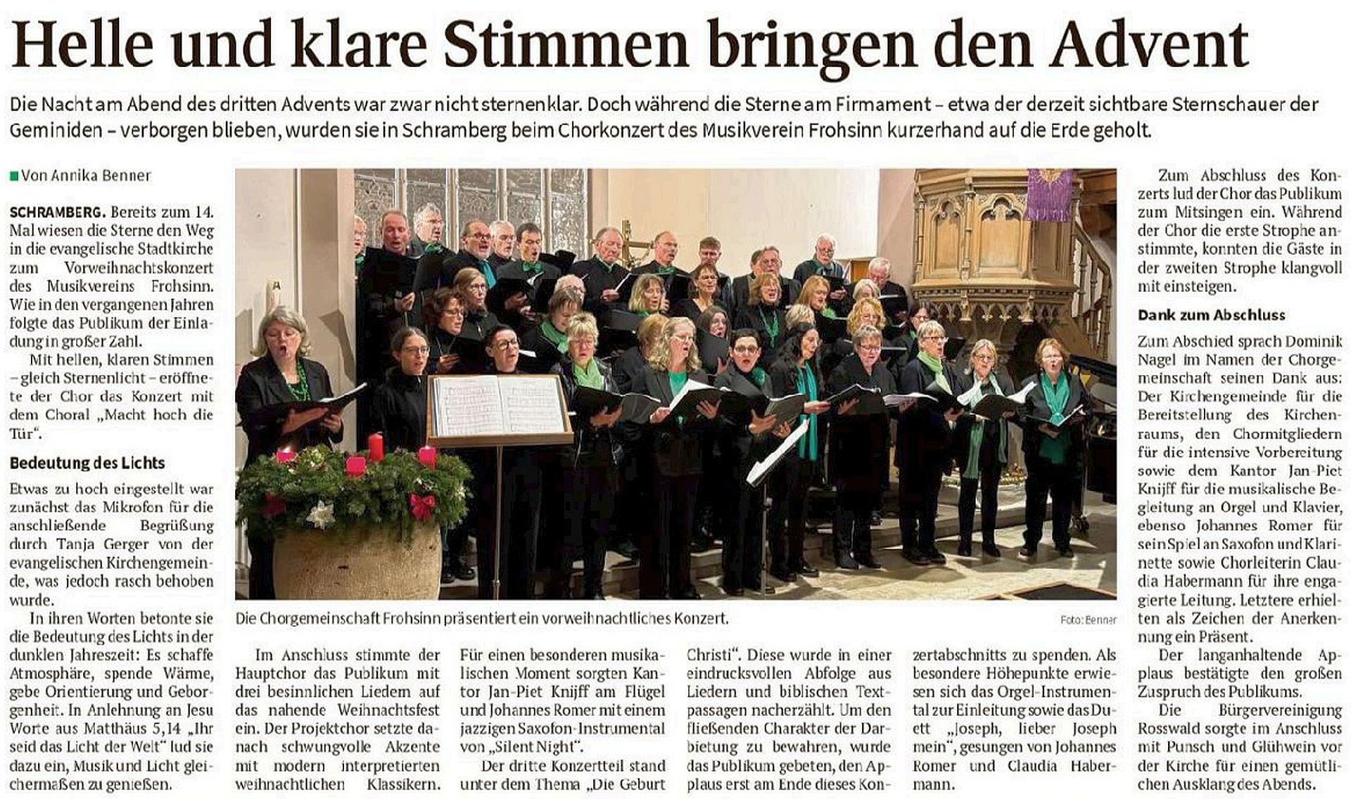 SCHRAMBERG Bereits zum 14. Mal wiesen die Sterne den Weg in die evangelische Stadtkirche zum Vorweihnachtskonzert des Musikvereins Frohsinn. Wie in den vergangenen Jahren folgte das Publikum der Einladung in großer Zahl.