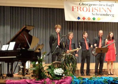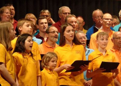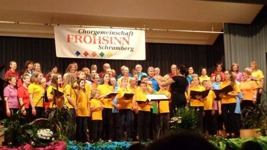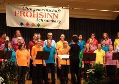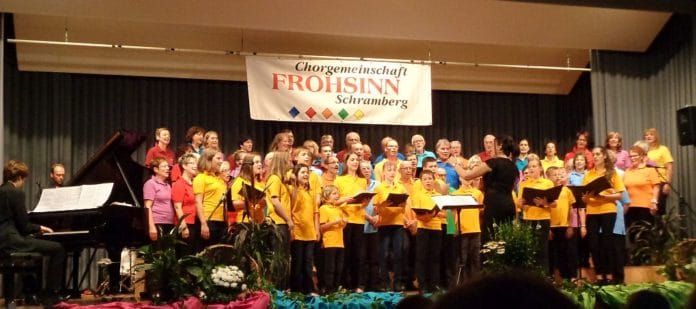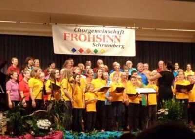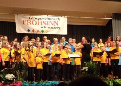 Schließlich betrat die größte Gruppe des Frohsinn, der „Confetti Chor & more“ die Bühne. Die Freude der Sänger an ihrem Tun war auch daran zu spüren, dass sie Lieder wie „For the longest time“ größtenteils auswendig sangen. Mit dem Konzerthöhepunkt, dem Auftritt aller Chöre zum „Halleluja“ von Leonard Cohen, berührten die Sänger die Herzen ihres Publikums und sorgten bei manchen sogar für Tränen. Dafür wurde die Chorgemeinschaft mit stehenden Ovationen beglückwünscht.