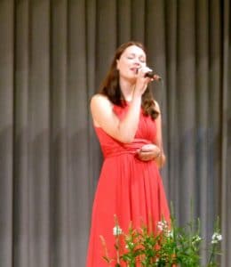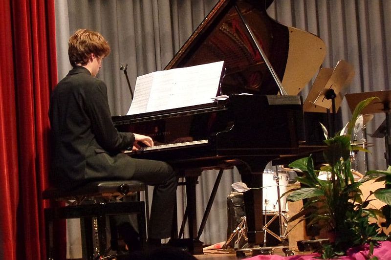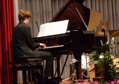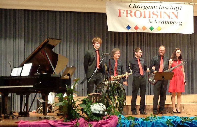Nach der Pause spielte der junge Pianist Benedikt Wild eine romantische Eigenkomposition „Farewell“. Nicht nur wegen ihres roten Kleids begeisterte Steffi Flaig gemeinsam mit der Johannes Rohmer Band das Publikum. Ihre wundervolle Stimme und die Klarinetten- und Saxofon-Soli gaben drei Evergreens eine ganz besondere Note: „Bei mir bis du schön“ swingte genauso wie der Cole-Porter Klassiker „I love Paris“.