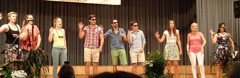 Nach „On the sunny Side of the Street“ hätten sich viele Besucher eine Zugabe gewünscht, doch es wartete schon die Sommerüberraschung: Die „Ehemaligen“ des Jugendchores traten mit einem herrlich, die 80er Jahre parodierenden Medley aus dem Tanzfilm „Grease“ auf.