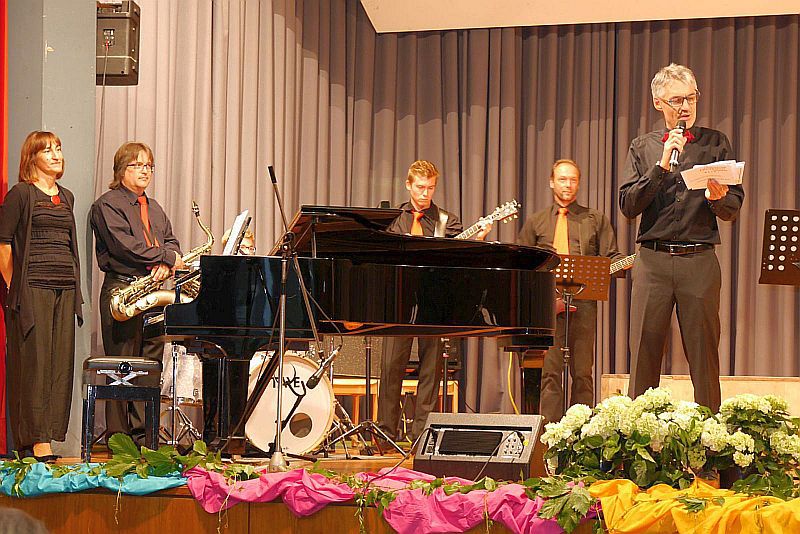 Erst besinnlich, dann voller Temperament, stimmte die Spitzenband um Johannes Romer (Saxofon), Claudia Seeber (Piano), Lukas Blessing (Gitarre), Markus Kammerer (E-Bass) und Leon Rink (Percussion), die Zuhörer ein mit dem beliebten Titel „Autumn Leaves“, wobei sich Pianistin und Saxofonist mit ihrem Solo gegenseitig anfeuerten. Den ersten Programmteil gestalteten die Chöre eher klassisch. Mit zwei Evergreens von Udo Jürgens widmete sich der Gemischte Chor, pfiffig begleitet von der Band, dem Segen und Fluch der alkoholischen Getränke.