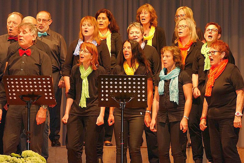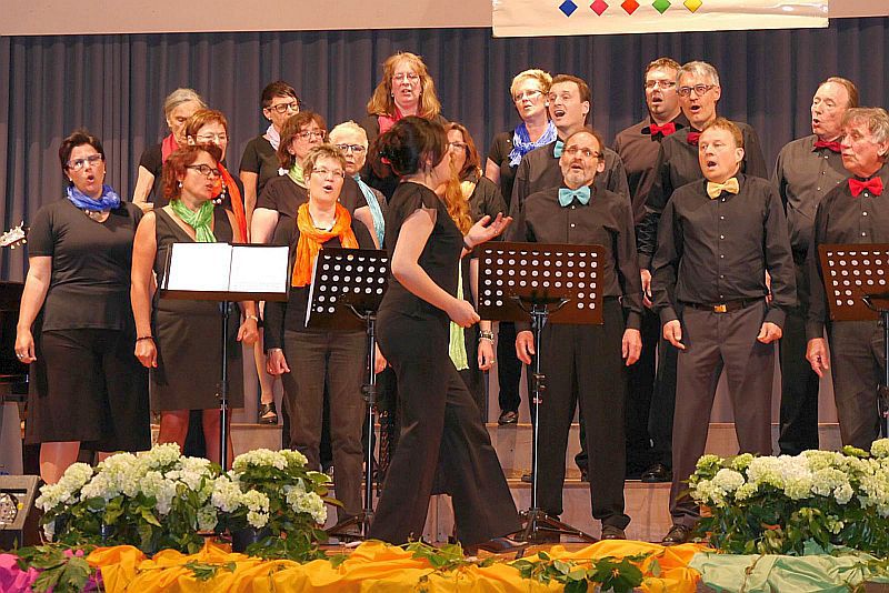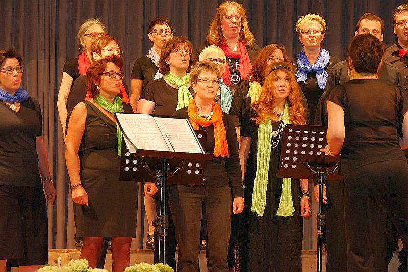 Ein neuer Höhepunkt des Programms wurde erreicht beim Auftritt des Chores CCM (Confetti Chor & More), der sich mit seinen circa 40 Mitgliedern inzwischen zum stimmgewaltigen Hauptchor des Vereins entwickelt hat und vorwiegend Titel aus Pop, Musical, Film und Gospel im Programm führt. Mit bunten Schals und Fliegen boten die Sängerinnen und Sänger,ein farbiges Bild. Der Dirigentin gelang es vom ersten Moment, die hoch motivierte Sängerschar in rhythmischen Schwung zu versetzen. Beim Chor „Diana“ boten Chor und Band eine Einheit in herrlichem Wohlklang. Witzige Urwaldrufe und ein Tonsilben-Continuo der Männer und Frauen untermalten den Titel „The Lion sleeps tonight“ und auch das Arrangement von „Stand by me“ wies wieder die kreative Handschrift der dirigierenden Arrangeurin auf.