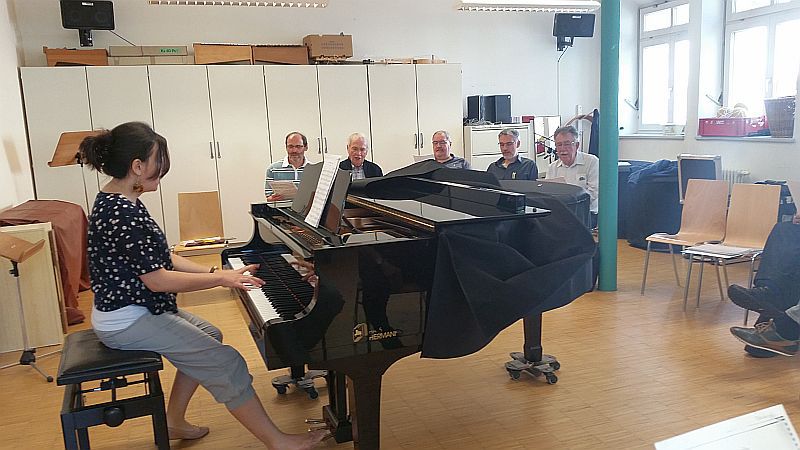 Am Sonntag, den 8. Mai traf sich der Männerchor der Chorgemeinschaft Frohsinn Schramberg e.V. um 10.00 Uhr zur inzwischen dritten Probierprobe in der Musikschule. Die Idee war und ist, neue singwillige und möglichst -fähige Männer von der Schönheit des Chorgesangs zu überzeugen und sie zum Mitsingen zu bewegen. Auch dieses Mal war es nicht gelungen, neue Sänger zu gewinnen. Im Wesentlichen trat nur die Stammmannschaft an. Doch auch so absolvierten die Männer unter der Leitung der charmanten Chorleiterin Claudia Habermann eine etwas andere Probe zu ungewöhnlicher Probenzeit. Die Chorleiterin: „Die Stimmen klingen am Morgen anders, eine tolle Intonation und man hört den Spaß der Männer am Singen.“ Insgesamt waren 15 Männer am Start. Zur Halbzeitpause wurde die Probe durch ein zweites Frühstück mit Zopf, Brezeln, Kaffee und frühschoppenzeitgemäß auch nach Wunsch mit einem kühlen Bier unterbrochen. Die willkommene Unterbrechung wurde ganz hervorragend durch Petra Schmälter vorbereitet und betreut. Nach der Pause ging es noch rund eine Stunde weiter mit dem zweiten Probenteil. Geprobt wurden während der frühen Singstunde die Stücke, die auch am 3. Juli beim Konzert „Gipfeltreffen der Töne im Tal“ vorgetragen werden. Gegen 12.30 Uhr fand die außergewöhnliche Probe dann ihr Ende. Die Chorleiterin bedankte sich bei den Männern für ihr Kommen. Die Meinung aller: „Das behalten wir bei.“ Die nächste Probierprobe wird im Vorfeld, vermutlich am 16.10.2016, anlässlich des Jahresabschlusskonzerts „1000 Sterne“ am 4. Advent stattfinden.