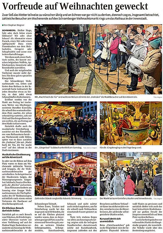Zwar ließ das Wetter teilweise zu wünschen übrig und an Schnee war gar nicht zu denken, dennoch zog es, insgesamt betrachtet, zahlreiche Besucher am Wochenende auf den Schramberger Weihnachtsmarkt rings um das Rathaus in der Innenstadt.